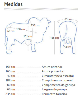 Touro que possui ótimo comprimento corporal, biotipo moderno com costelas compridas e bem arqueadas, ótima estrutura óssea e boa pigmentação.